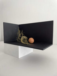 The composition is a journey suspended in the heart of time. The experimentation space is painted with indigo, a natural flour-based paint (traditional Swedish paint). The brush strokes are visible, “spins” hooking the light onto the dark material. On the surface, a partially polished steel sphere confirms gravity. The cosmos is within. A partition where the states are superimposed.