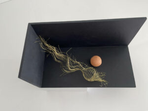 Indigo-painted wood support 15x15x30cm, weaving in brass wire, raw clay sphere.